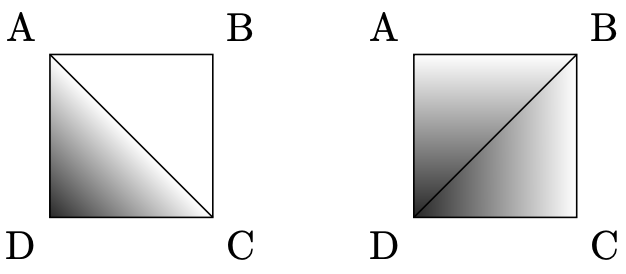 Preparing the map must have been quite a struggle for Blackbeard, since there is no unique natural way to interpolate the depths of points with non-integer coordinates. Consider a unit square on the grid, with corners at the grid points $A$, $B$, $C$, and $D$ in clockwise order, and some depth $d(p)$ stored for each $p ∈ \{A, B, C, D\}$. One natural way is to interpolate the depth in the triangle $ABC$ linearly, and likewise in $CDA$. Another equally natural way is to interpolate linearly within $BCD$, and likewise within $DAB$. Usually, the results of those two interpolations are different. For example, if $d(A) = d(B) = d(C) = 0$ and $d(D) = 1$, the first method results in depths across all of $ABC$ being equal to zero (Figure K.1 left), while the second method results in the depths being positive in the whole interior of the square (right).
