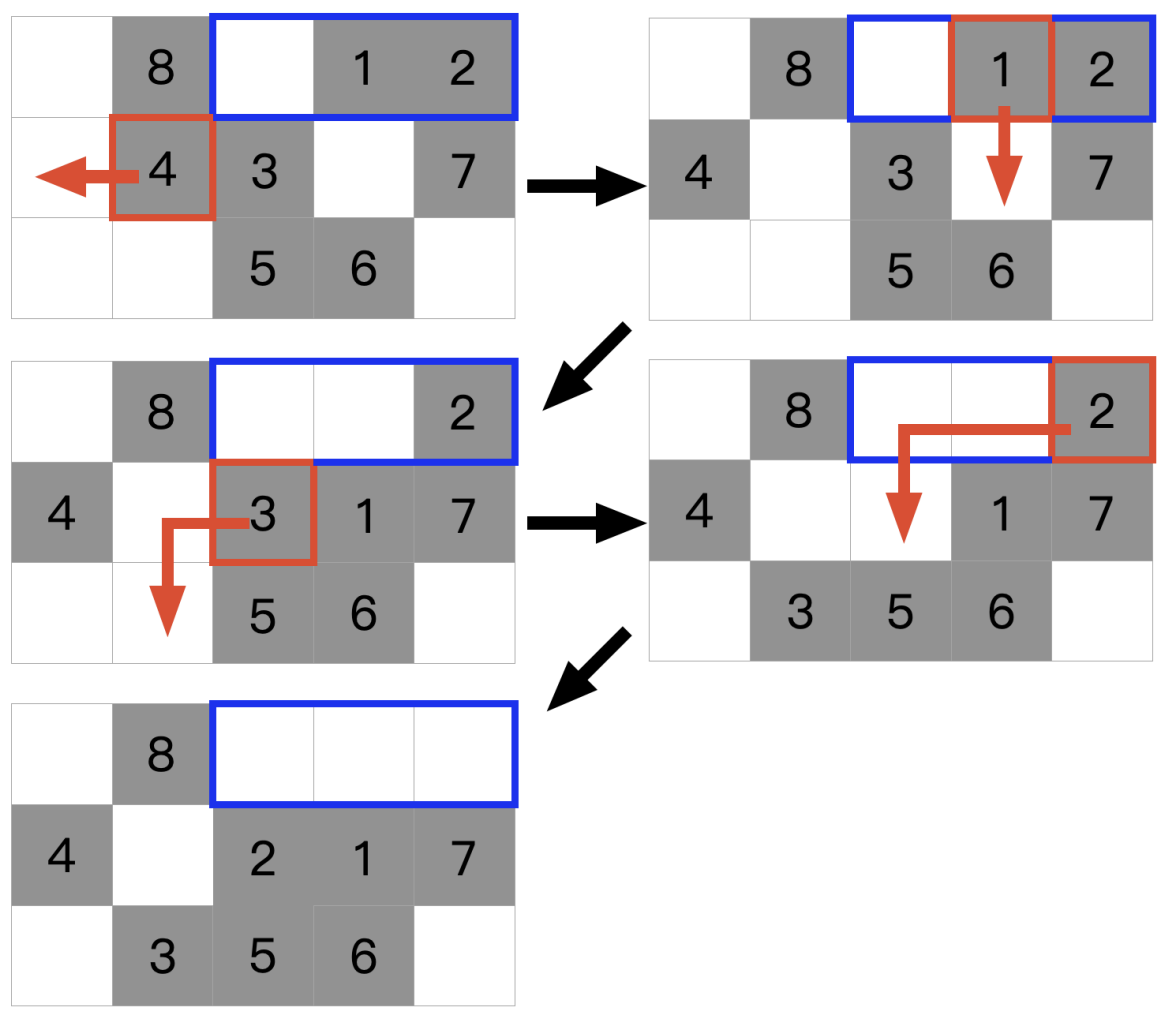 For example, suppose the device will be placed at the blue rectangle. Then Barbara can rearrange the slabstones as follows. Please note that the slabstones do not overlap during the whole process, not only after the rearrangement. All slabstones that have been moved have index at most $4$, so the energy spent is $4$.