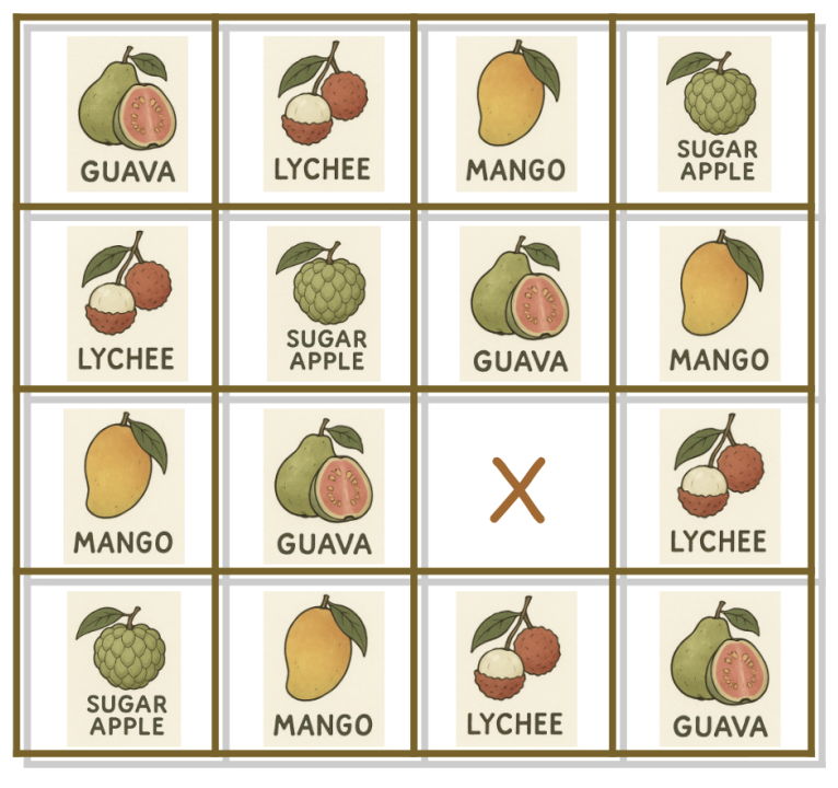 Their rule is simple: They can only take a fruit if, after removing it, the remaining fruits in the box still uniquely determine the original $4 \times 4$ display (i.e., there’s only one way to complete the display while preserving the distinct-fruit-per-row-and-column rule).