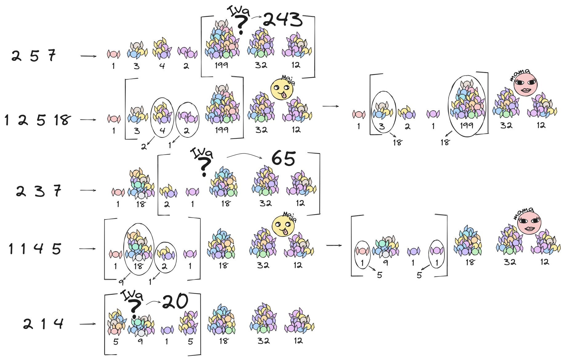 Maja je odmah pojela sve bombončiće koje su odmah mogle podijeliti, a nakon toga je započela cjelodnevna rasprava oko toga kako podijeliti neparne hrpe. Na kraju dana, kada su obje zaspale, njihova mama je potajno zamijenila sve hrpe oko kojih se nisu mogle dogovoriti tako da je na svakoj takvoj hrpi sada točno $x_i$ bombončića.