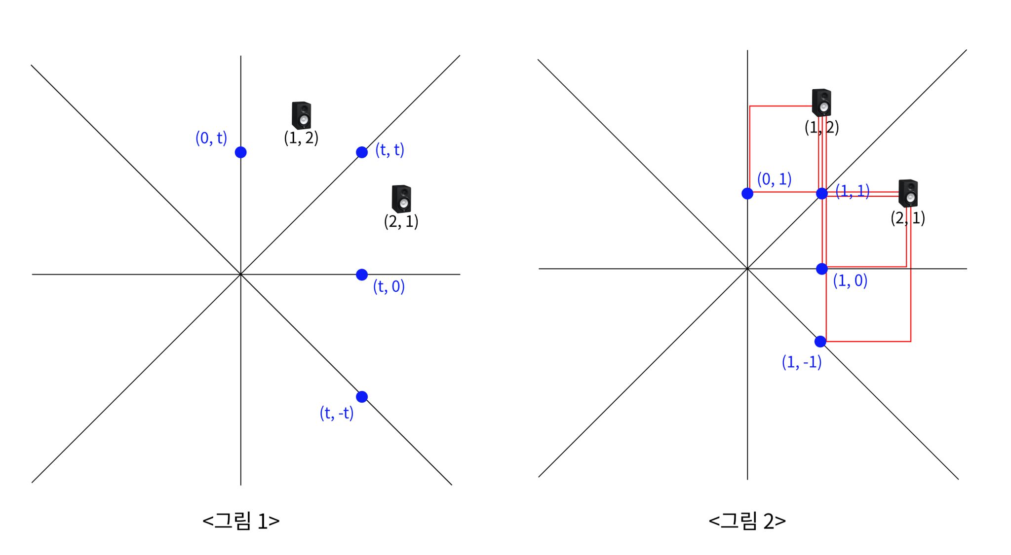 위는 스피커가 $(1, 2), (2, 1)$에 있을때의 예시를 나타낸 것이다. <그림2>를 보면 $t = 1$일 때 각 사람에 대해서 스피커까지의 맨해튼 거리의 합 즉,$G(1) = 16$으로 최소이다. 인접한 값 $t = 0, 2$에서는 각각 $G(0) = 24, G(2) = 18$로 더 크다. 따라서 최적의 선택은 $t = 1$이고 출력은 $16$이다.