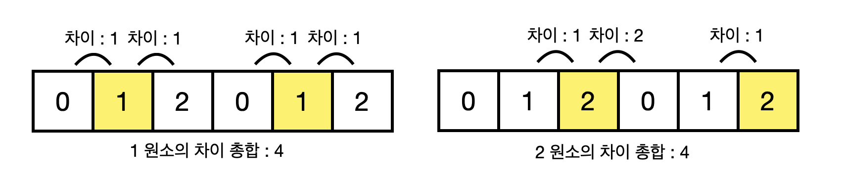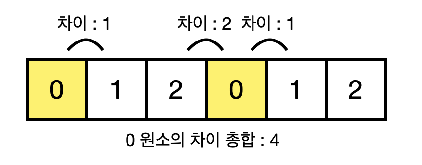 또한, 0 원소들의 인접한 차이의 총합을 구해보면, 우선 첫 번째 원소 0은 왼쪽 원소는 없고 오른쪽 원소와의 인접한 차이가 $\vert 0-1\vert =1$이므로 $1$을 기여하고, 네번째 원소 0은 $\vert 2-0\vert +\vert 0-1\vert =3$이므로 $3$을 기여하여, 0 원소들의 인접한 차이의 총합은 $4$이다.