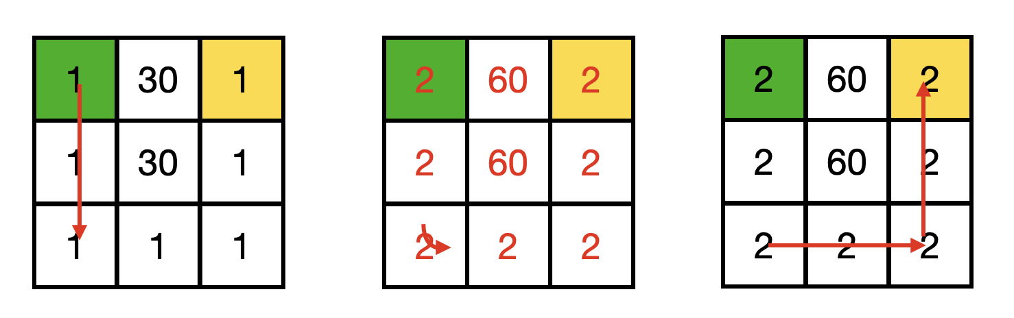 DDRRUU로 이동하는 경우 당도 수치는 $11$이 되어, 이는 당도 수치를 최소화 하는 경로이다.