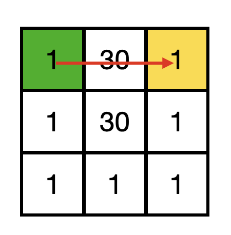 형진이가 실제로 섭취한 총 당분의 양을 우리는 당도 수치라고 부른다. 당도 수치는 형진이가 방문한 각 칸에 대해, 그 칸의 초콜릿 $1$개의 당도 $A_{i,j}$와 그 칸에서 먹은 초콜릿 개수를 곱한 값을 모두 합한 것이다. 우리는 형진이의 건강을 위해 이 당도 수치를 가능한 한 작게 만들고자 한다. 즉, 시작점 $(r_1, c_1)$에서 출발하여 도착점 $(r_2, c_2)$에 도달하는 모든 가능한 경로들 중에서, 당도 수치를 최소로 만드는 경로를 하나 찾아서 출력해야 한다. 이때 같은 칸을 여러 번 지나는 경로도 허용되며, 그때마다 해당 칸의 초콜릿을 다시 먹는다는 점에 유의한다.