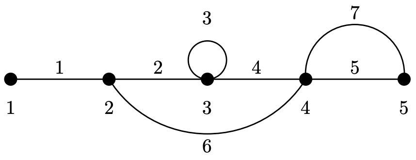In this example, the graph has $5$ vertices and $7$ edges; edges $1$ through $7$, in this order, are $(1, 2)$, $(2, 3)$, $(3, 3)$, $(3, 4)$, $(4, 5)$, $(2, 4)$, $(4, 5)$.