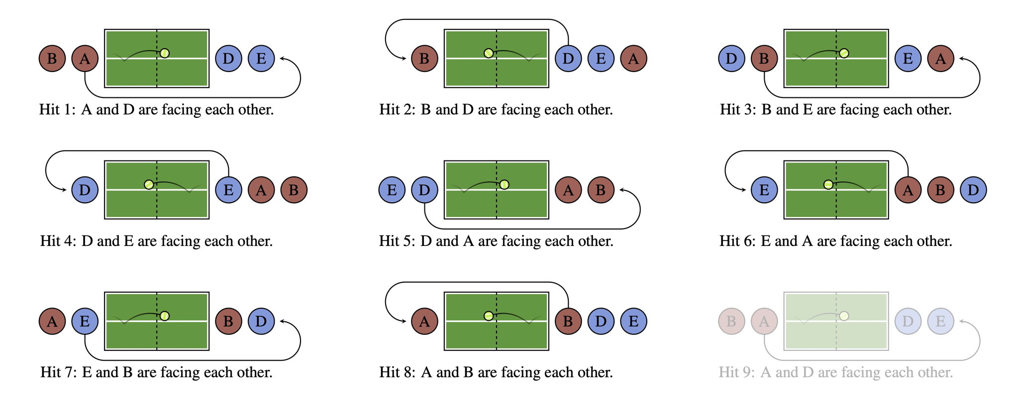 Emilia, Alex, and their friends play this game all the time and are so good that they can go on almost forever without making any mistake. After some time, Emilia notices that she has never faced Alex, meaning that they have never been at the front of opposite queues at the same time. She wonders if this will ever happen in this round. Curious about this, she starts keeping track which pairings have already faced each other.