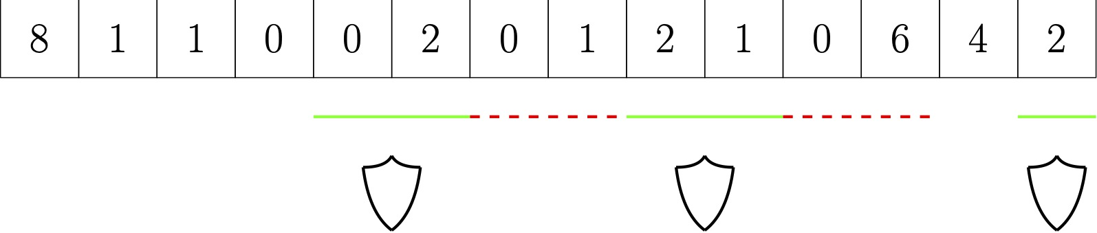 Figure M.1: Illustration of Sample 3. The numbers in the boxes indicate the potentials of the spells. In this example, your shield's activation duration is $d = 2$. By activating the shield right before the 5th, 9th, and 14th spell, you block the spells underlined in green. You cannot activate your shield for the spells that are underlined with a dashed red line, because it is regenerating its magic at these times.