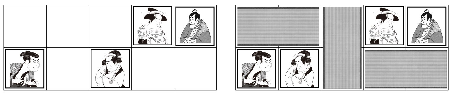 The left figure shows the initial positions of the tiles for Sample Input 1, and the right figure shows one possible way to move one tile and arrange tatami mats to cover all the empty cells.