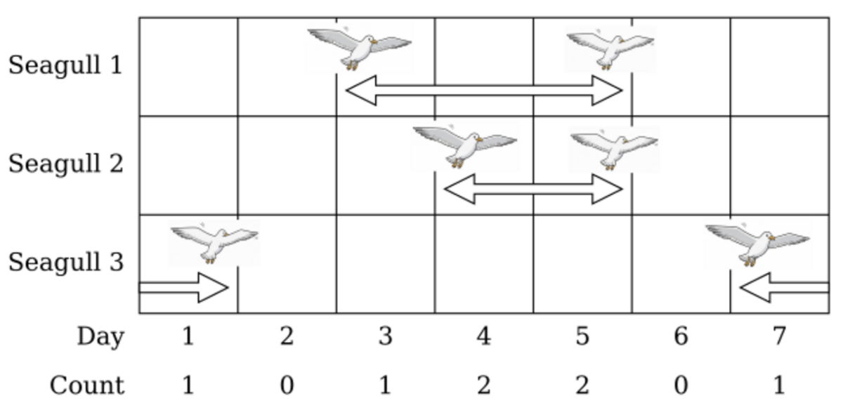 Note that seagulls that leave the island on one evening and come again on the next morning are counted on all days in a year.