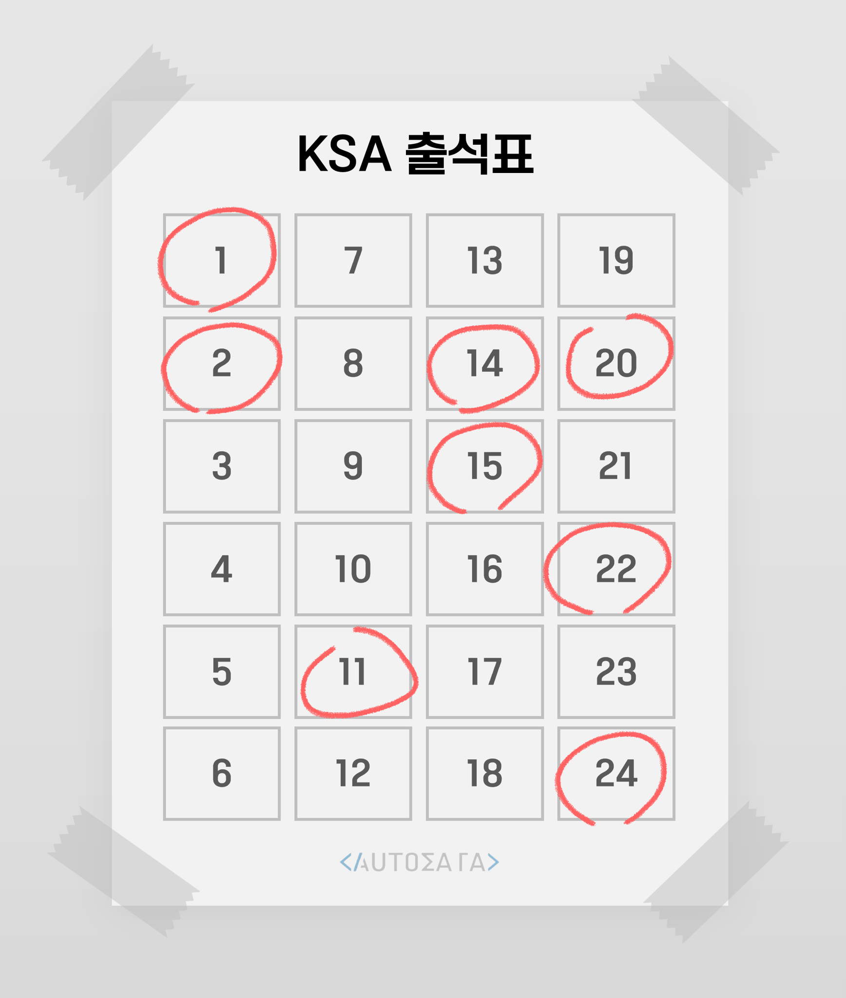 하지만 아침 점호에 참여하기 게으른 일부 학생들이 친구에게 점호를 대신 맡기기 시작했다. 점호를 대신 맡은 학생은 사감 선생님께서 지켜보고 계시지 않는 틈을 타서 재빠르게 자신과 점호를 맡긴 학생, 총 두 명의 번호 위에 동그라미를 그린다. 단, 사감 선생님께 걸리지 않기 위해 번호의 차가 $1$이면서 출석부 칸의 한 변이 인접한 학생에게만 점호를 대신 맡길 수 있다.