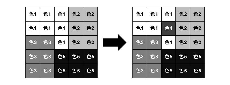 以下のように,上から 2 行目,左から 3 列目のマスを色 4 で塗り替えることで,カラフル度 5 を達成することができる.