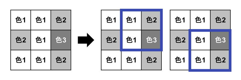 たとえば,下図左のようなポスターを作った場合,下図右に示す 2 つの長方形領域について 3 種類以上の色を含むため,カラフル度は 2 である.