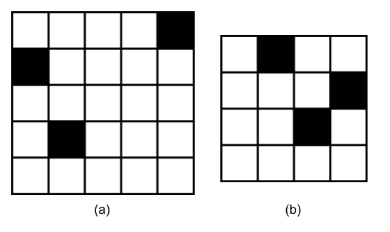 Figure 1: (a) A $5 \times 5$ photo that corresponds to $[1,4,4]$. (b) A $4 \times 4$ photo that also corresponds to $[1,4,4]$.