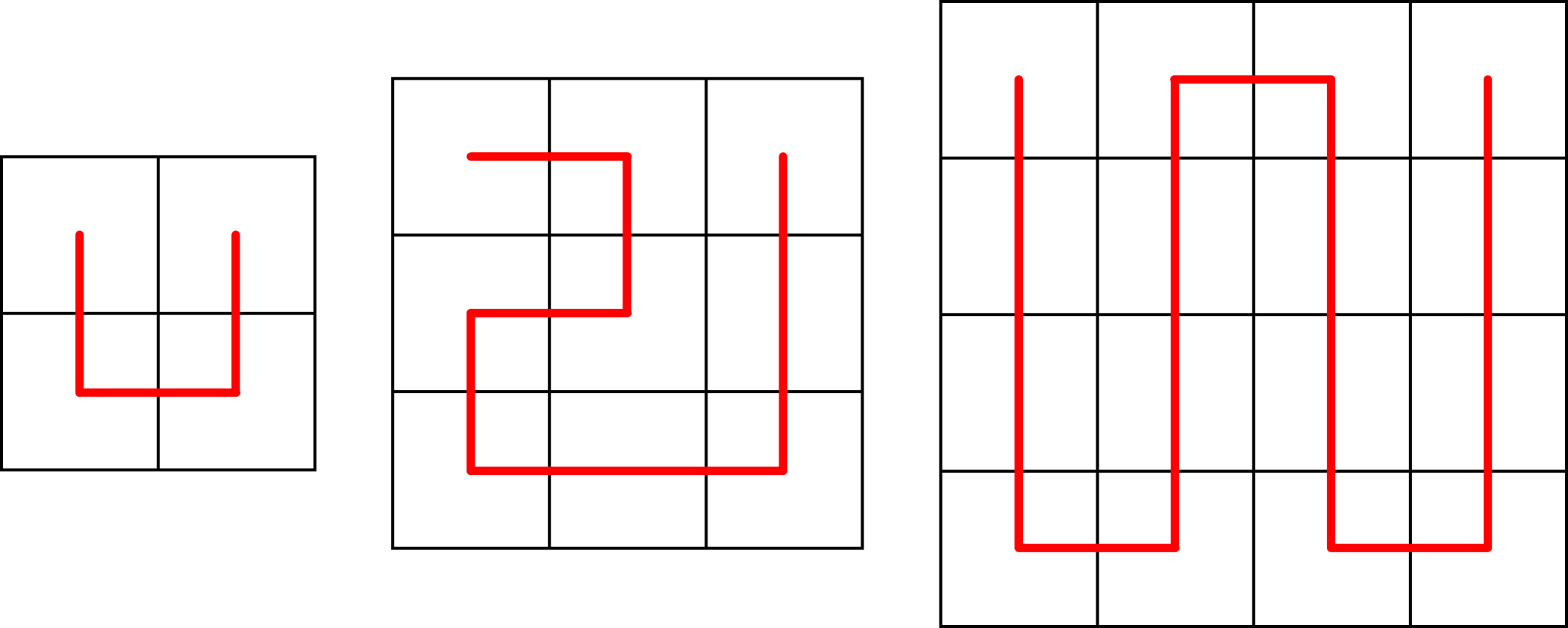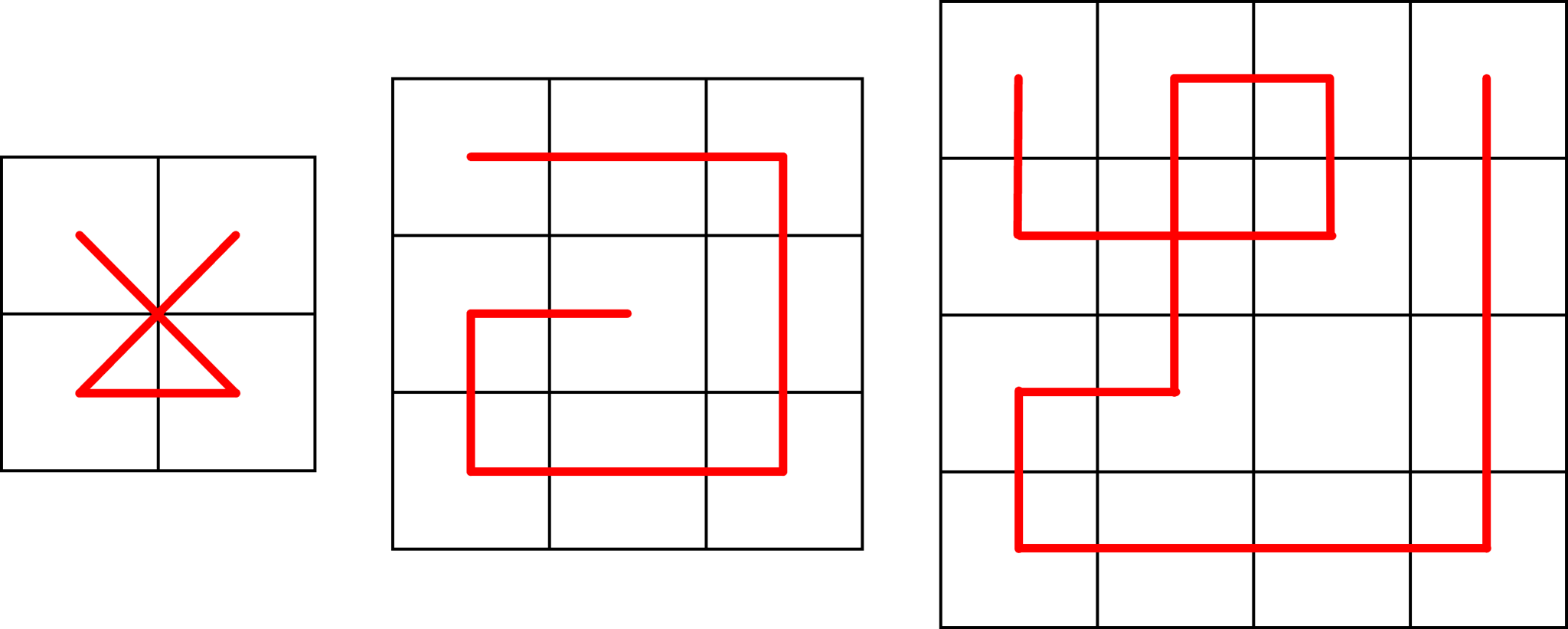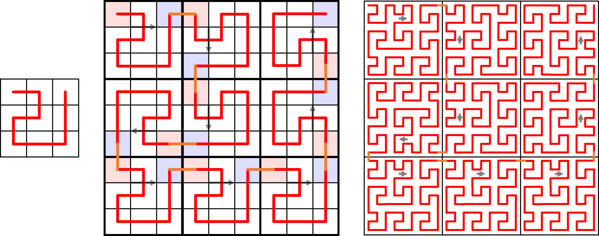 예를 들어, 다음 사진은 입력으로 주어진 패턴과, 각각 $2$번, $3$번의 재귀를 거친 패턴이다. 화살표나 칸의 색깔, 선의 색깔 등은 이해를 돕기 위한 것으로 실제 패턴에는 영향을 끼치지 않는다.
