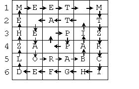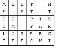 A text message is placed into a 2D array in row major order, with each character in a unique cell of the array. If the message does not totally fill the array, the empty cells are filled with the capital letters of the alphabet starting with the letter A and going thru the letter Z (repeated as needed). For example, the message, "Meet me at the pizza parlor" in a 6 by 6 array would look like the figure below. Note that all characters are stored as capital letters.