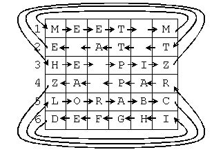 Roll: Each odd "loop" around the matrix is rotated to the right one character, while each even "loop" is rotated to the left one character, as shown in the figure below. "Loops" are even or odd based on the row number of their top most row (with the top row being row 1).