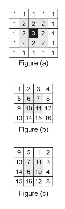 Any square grid can be viewed as one or more rings, one inside the other. For example, as shown in figure (a), a 5 ∗ 5 grid is made of three rings, numbered 1,2 and 3 (from outside to inside.) A square grid of size N is said to be sorted, if it includes the values from 1 to N2 in a row-major order, as shown in figure (b) for N = 4. We would like to determine if a given square grid can be sorted by only rotating its rings. For example, the grid in figure (c) can be sorted by rotating the first ring two places counter-clockwise, and rotating the second ring one place in the clockwise direction.