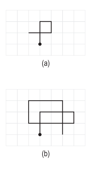 Imagine a 2D diagram drawn in the following way: Starting at the origin, you’re given a sequence of letters which is entirely made of the following four letters ’U’, ’D’, ’L’, and ’R’. A ’U’ is an instruction for you to move one unit upward and drawing a segment at the same time. Similarly, ’D’ is for moving down, ’L’ for left, and ’R’ for right. For example, figure (a) is drawn by giving the sequence ’UURDLL’ while figure (b) is the result of ’UURRRDLLLLUURRRDDD’ (in both figures, the starting point is identified by a small circle.)