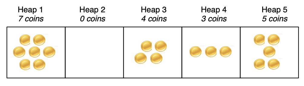 At the end, Sam has 7 + 3 = 10 coins which is more than Quorra, and hence Sam wins this game. In fact, Sam can win no matter what Quorra does – if she chooses the heap 2 with 0 coins, then Sam can take the heap with 5 coins, and end up with a higher total score of 15 or 16 coins.