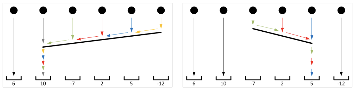 The optimal setting of right / left obstacles is shown in the images. By setting the right obstacle as shown in the right image, balls 3, 4 and 5 will fall down into hole number 5 and the score will be 6 + 10 + 5 + 5 + 5 + (-12) = 19 points. Analogously, by setting left obstacle as on the left image, we get 6 + 10 + 10 + 10 + 10 + 10 = 56 points. It is not possible to score more points with any different obstacle setting.
