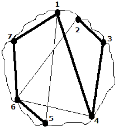 The figure shows the lake and the cities around it. The lines (both thick and thin) represent commercial agreements between cities. The thick lines represent a commerce route starting in city 2 and ending in city 5.