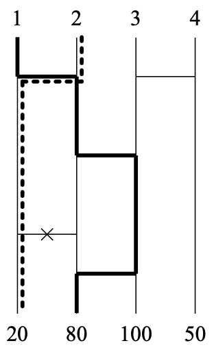 세로줄 i의 상단부터 순서대로 길을 따라가게 되고, 하단에 적혀있는 정수가 그 막대기 i를 선택할 때 얻는 정수이다. 예를 들어, 위의 그림에서 세로줄 1을 선택하면 80점을 얻게 되고, 2를 선택하면 100점을 얻게 된다.