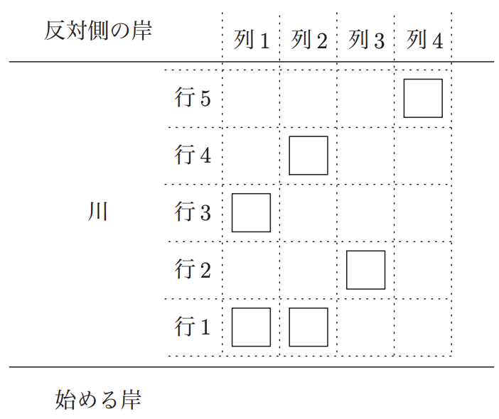 ある川で,一方の岸から石の上を次々と飛び移って反対側の岸まで行くという少々 危険なゲームがはやっている.