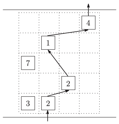 図 4-2 において,石に書かれた数字はそれぞれの石の滑りやすさを表すとする. 矢印で示された順番で石を渡るとき,それぞれのジャンプの危険度は,順番に 0, (2 + 2) × 1 = 4,(2 + 1) × 1 = 3,(1 + 4) × 2 = 10,0 であり,合計は 17 となる. このとき,ジャンプの危険度の合計は最小となる.