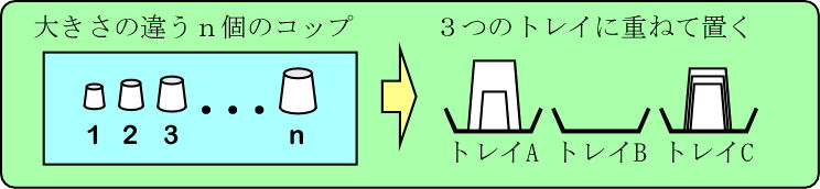 このように, コップの初期状態が与えられたとき, 次の規則 1 ~ 3 を守りながら, すべてのコップを A または C のどちらかのトレイに移動させるには何回移動を行えばよいかを求めたい.
