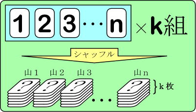 次のようなゲームを考える. 1 から n までの数が 1 つずつ書かれた n 枚のカードが k 組ある. これら kn 枚のカードをよくシャッフル(よく切ること)して, k 枚ずつの山を作り横一列に並べる. このようにしてできる n 個の山の左から i 番目の (k 枚のカードの)山を「山 i 」と呼ぶことにする.
