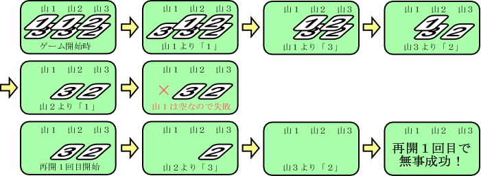 途中で失敗した場合には, そのまま失敗で終了するか, または残ったカードの山をそのまま (山の番号もそのまま) にしてゲームを再開する. ゲームを再開する場合は, 最初に引くカードはカードが残っている山のうちの一番左の山からとする (その山の一番上のカードが最初に引かれるカードとなる). 再開後も再開前と同様の方法でゲームを進め, すべての山にカードが無くなれば成功であり, まだカードが残っている山があるのに, 次にカードを引くべき山が無くなった場合は失敗である.