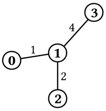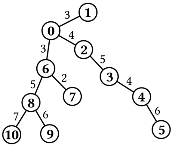 파타야 인근 지역에는 N 개의 도시가 있고 N-1 개의 고속도로가 이 도시들을 연결하고 있다. 각 고속도로는 양방향이며 서로 다른 두 개의 도시를 연결한다. 각 고속도로의 길이는 킬로미터 단위로 나타내며 정수 값이다. 그리고 임의의 두 도시는 직접 고속도로로 연결되지 않더라도 단 하나의 경로에 의해 연결된다. 즉, 같은 도시를 두 번 이상 방문하지 않고 한 도시에서 출발하여 다른 도시에 도착하는 방법은 유일하다.