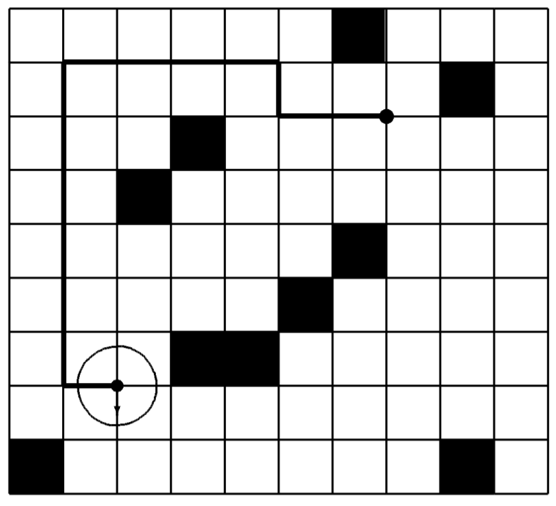 The Robot Moving Institute is using a robot in their local store to transport different items. Of course the robot should spend only the minimum time necessary when travelling from one place in the store to another. The robot can move only along a straight line (track). All tracks form a rectangular grid. Neighbouring tracks are one meter apart. The store is a rectangle N x M meters and it is entirely covered by this grid. The distance of the track closest to the side of the store is exactly one meter. The robot has a circular shape with diameter equal to 1.6 meter. The track goes through the center of the robot. The robot always faces north, south, west or east. The tracks are in the south-north and in the west-east directions. The robot can move only in the direction it faces. The direction in which it faces can be changed at each track crossing. Initially the robot stands at a track crossing. The obstacles in the store are formed from pieces occupying 1m x 1m on the ground. Each obstacle is within a 1 x 1 square formed by the tracks. The movement of the robot is controlled by two commands. These commands are GO and TURN.