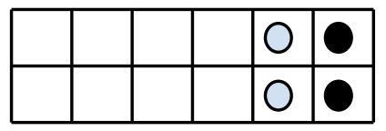 As an example, consider the initial placement as shown in the figure on the left below. With the first move, the first player can slide the white checker in the first row all the way to the right, thus preventing the second player from being able to move, and winning. On the other hand, in the second game, though it looks highly favorable to the first player, he loses because each of his moves creates a move for the second player, and eventually all his white checkers will get blocked on the other (left) side of the board.