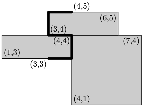 Tekstifaili esimesel real on maatükkide arv $N$ ($1 \le N \le 1000$). Järgneval $N$ real on maatükke defineerivate ristkülikute alumise vasakpoolse ja ülemise parempoolse nurga koordinaadid $X_0$, $Y_0$, $X_1$, $Y_1$. Viimasel kahel real on punktide $A$ ja $B$ koordinaadid $X_A$, $Y_A$ ja $X_B$, $Y_B$. Kõik koordinaadid on mittenegatiivsed täisarvud, mille väärtus ei ületa $1\,000\,000$. On teada, et punktid $A$ ja $B$ on maatükkide servadel. Lisaks on teada, et kõik maatükid on ühel saarel, kuigi saarel võib olla ka järvi.