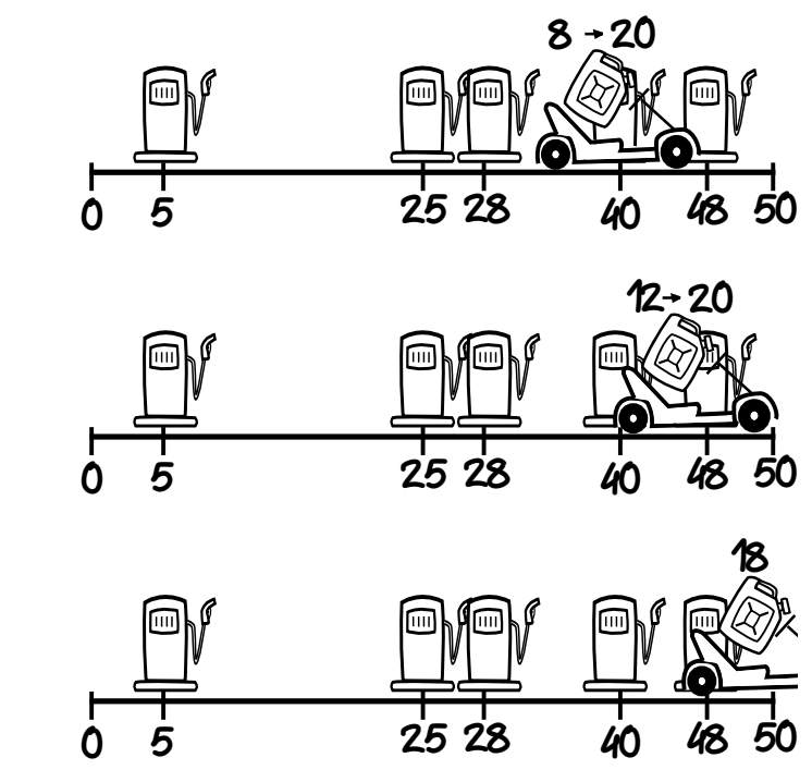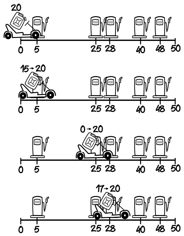 Sakykime, kartas turi 19 litrų kuro baką. Pirmiausiai jis privažiuos stotelę ties 5-u kilometru – čia jis papildys savo baką nuo 14 iki 19 litrų. Toliau kartui jau nebepavyks pasiekti kitos stotelės, nes jo bakas ištuštės ties 24-u kilometru.
