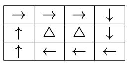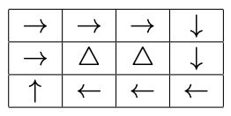 Abiejuose salos langeliuose viesulinis vėjas. Pradiniu momentu, plunksna judės į langelį Rytų kryptimi: