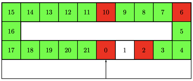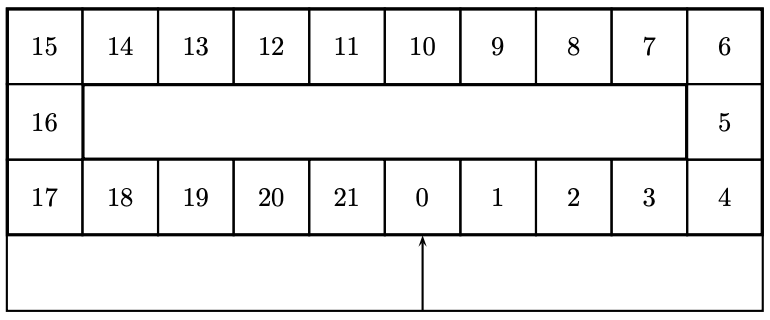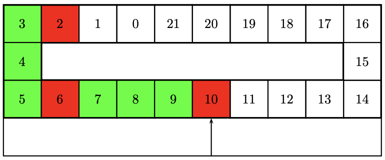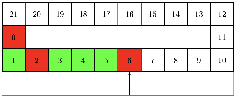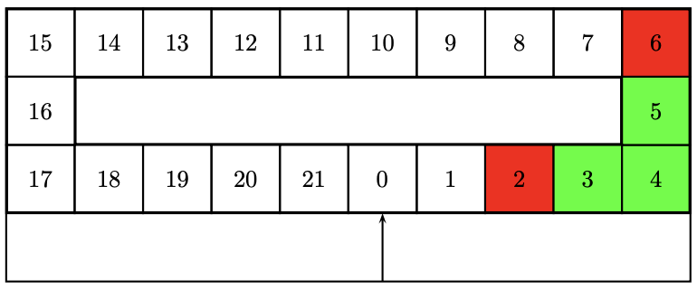 We model the rail as an array of dimension N, referenced in a circular way, that is indices are to be considered modulo N. When a batch of n clothes must be stored, the launderer types the number n on a keyboard. The computer then looks for the first location of n+2 free hooks, from the current position of the rail to the right, yielding zone k..k + n + 1 (all indices considered modulo N). Once this is done, the rail moves so that hook numbered k + n + 1 arrives on the mark, and the launderer puts the n clothes on the hooks k + 1..k + n. Hooks k and k + n + 1 are not used to store clothes, but are used as “separators” between batches of clothes. The launderer then gives the ticket number k to the customer. Hooks used to hang the clothes of some customer are assigned to the customer, even during the actual cleaning of the batch of clothes.