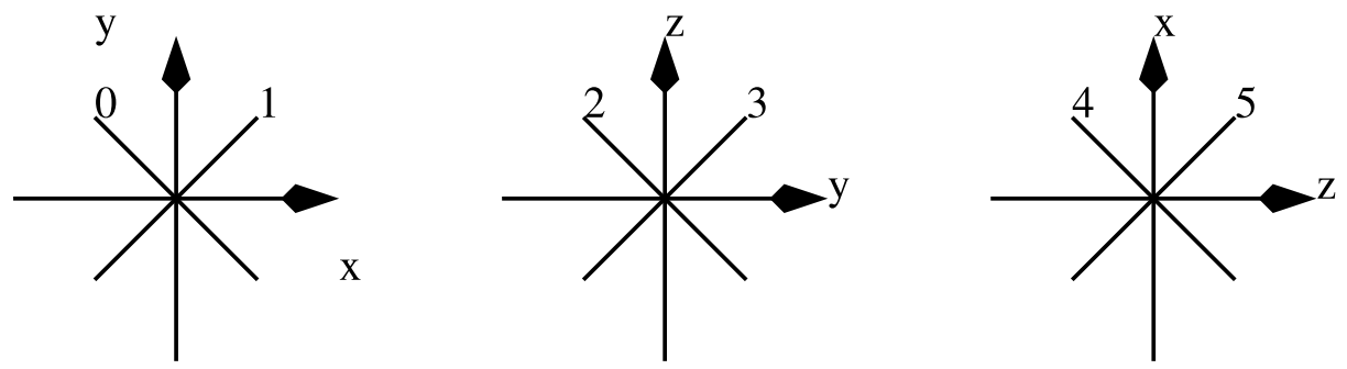 You are requested to simulate the behavior of the cube. Given the position and the orientation of each mirror, you are kindly asked to compute, for each face, the number of rays that go out of the face of and the total number of times the corresponding rays have been deviated. Note that when the direction of a ray belongs to the plane of a mirror, it passes through without any interaction.