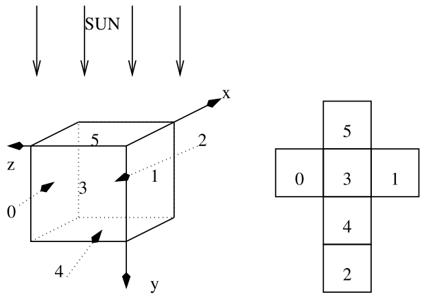 Bob and Alice analyze the cube by putting a light sensor in front of each face of the cube. This simple experiment allows them to compute the amount of light reflected through the corresponding face (i.e., the number of holes through which a light ray emerges). More precisely, the cube is oriented in the following way (the sun is on the y < 0 axis) and there is one unit of light which enters the cube on every integer coordinate of the upper face (y = 0, 0 ≤ x ≤ s, 0 ≤ z ≤ s).