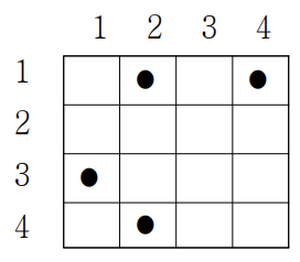 행의 크기와 열의 크기가 각각 N인 격자공간에 M개의 점이 있다. N = 4이고 M = 4인 경우의 예가 아래에 있다. 격자공간 왼쪽의 숫자는 행 번호이며, 위의 숫자는 열 번호를 나타낸다. 그리고 격자공간내의 각 사각형의 위치는 (행 번호, 열 번호)로 표시한다