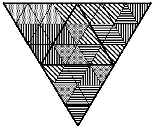 Figure 3 shows the initial coloring of the tetrahedron, and Figures 4 and 5 show the results of each operation. The colors of the triangles are given by the following patterns: