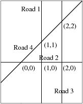 "Segment is the shortest path connecting two points" - this motto was the main motivation for road designers in the Byteantean Empire. For this reason all roads constructed in the Empire were straight and led across the whole country. At each crossing of two roads Byteanteans planted a town. To avoid misunderstandings, Byteanteans never constructed more than two roads that would intersect at a single point.