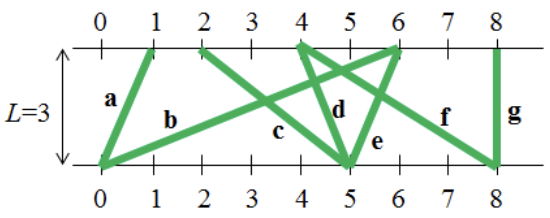 다양한 길이의 막대기를 가지고 즐길 수 있는 게임이 있다. 게임을 시작하기 전에 간격이 L인 두 개의 평행한 수평선을 책상 위에 긋고, 막대기의 양 끝이 각 수평선에 하나씩 위치하도록 놓는다. 여러 개의 막대기 끝이 수평선 위의 한 점에서 만날 수는 있지만, 두 막대기가 완전히 겹쳐져 있는 경우는 없다. 놓여 있는 각 막대기는 (t, d)로 표현된다. 여기서 t는 위쪽 수평선에서의 좌표이고 d는 아래쪽 수평선에서의 좌표이다. 아래 그림 1에서 막대기 a는 (1, 0), 막대기 b는 (6, 0)으로 표시된다.