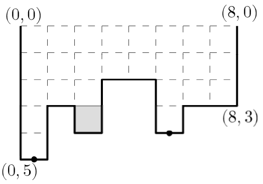 그림 1에서 보는 것처럼, X-축은 왼쪽에서 오른쪽으로 증가하고, Y-축은 위쪽에서 아래쪽으로 증가한다. 바닥을 나타내는 수평선분에 구멍이 있다면, 그 수평선분의 y-좌표와 같거나 작은 위치에 있으면서, 중력에 따라 구멍으로 흘러 들어갈 수 있는 위치에 있는 물은 모두 그 구멍을 통해 외부로 배출된다. 따라서 그림 1의 수족관의 물은 남김없이 모두 빠진다.