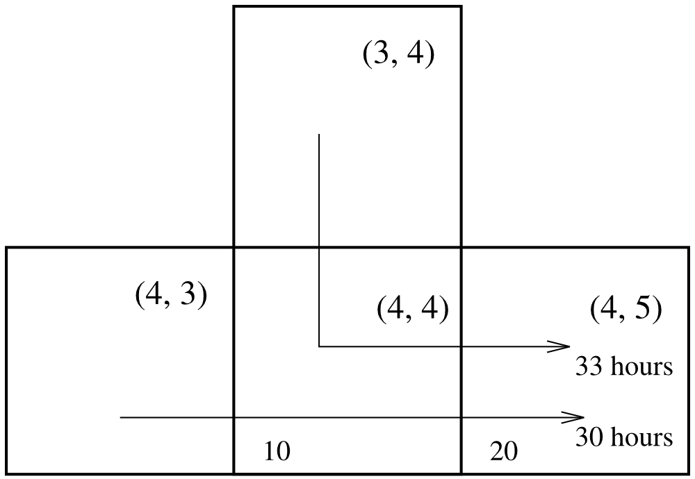 Turning during the Sea Travel is not easy. Sailors need to handle the change of the wind direction. Ships also need to slow down first and gain momentum later. It is mysterious but true, if a ship is already moving in one particular direction, it will take exactly 3 hours to change course. For example, if t[4,4]=10 and t[4,5]=20, then it takes 30 hours to sail the regions (4,3), (4,4), (4,5); but it takes 3 more hours, or 33 hours, to sail regions (3,4), (4,4), (4,5).
